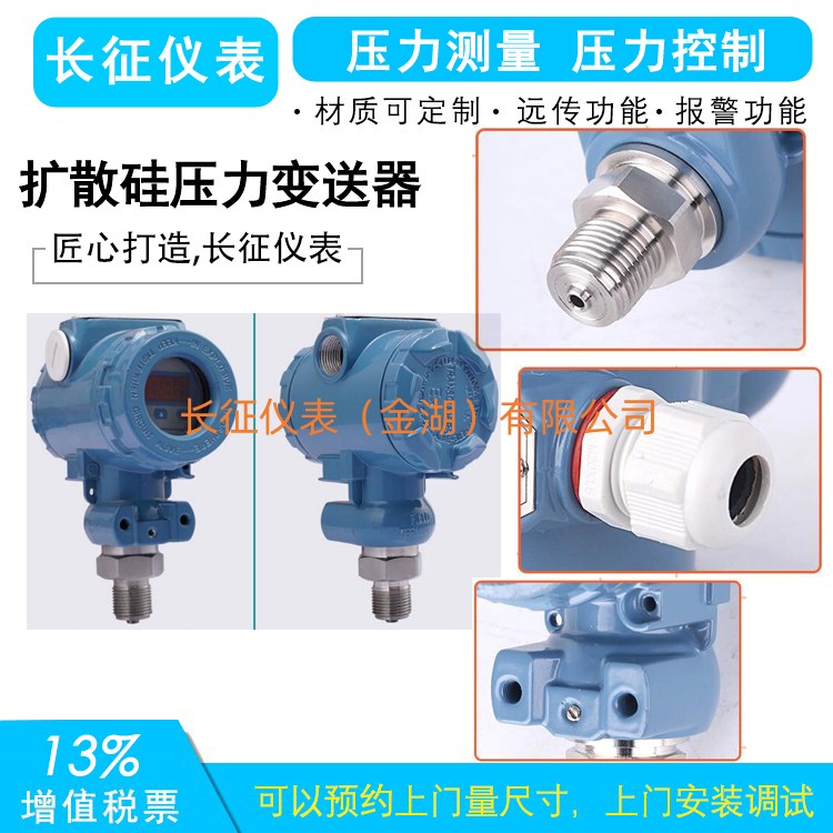 擴散硅壓力變送器主要特點抗過載和抗沖擊能力強,過壓可達量程的數倍,甚至用硬物直接敲打測量元件也不致使其損壞,且對測量精度毫無影響;安裝維護方便、可任意位置安裝。